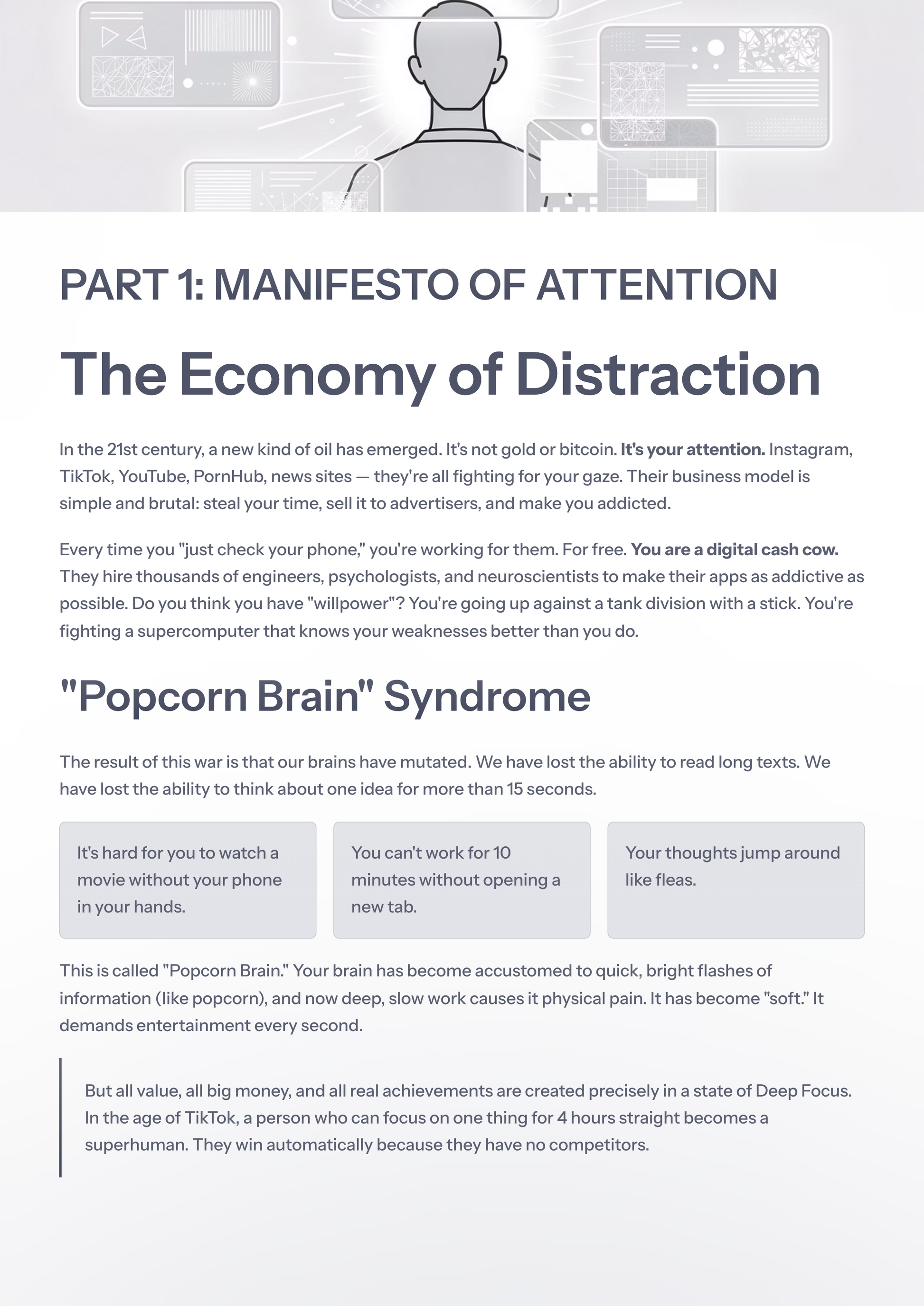 In the 21st century, attention is the new oil. TikTok, Instagram, and news sites are fighting a war for your gaze. Their weapon is cheap dopamine. The result? "Popcorn Brain."