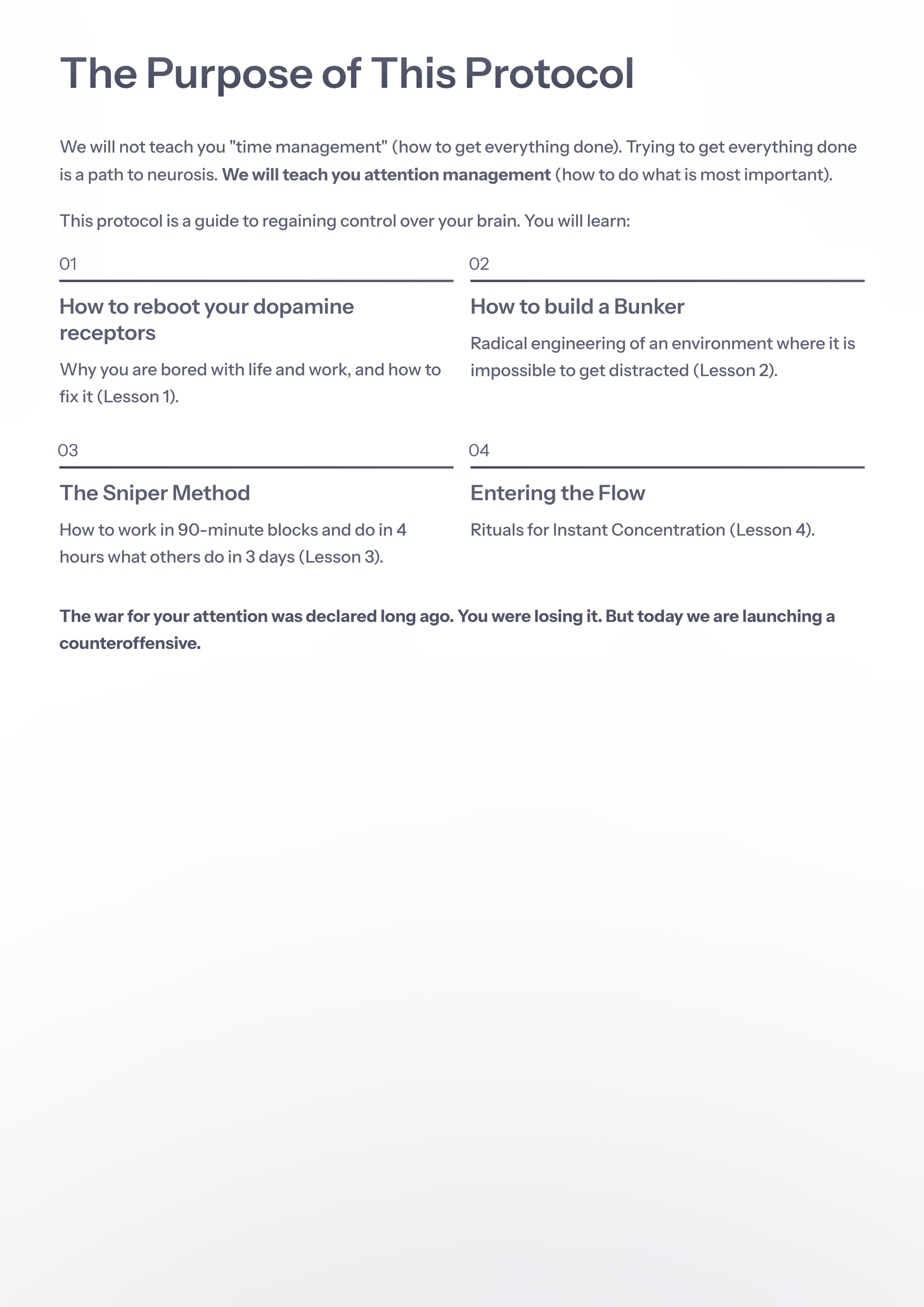 - ✅ GUIDE 3: DEEP FOCUS (PDF) — 18 pages of neuroscience and tactical instructions. No fluff.