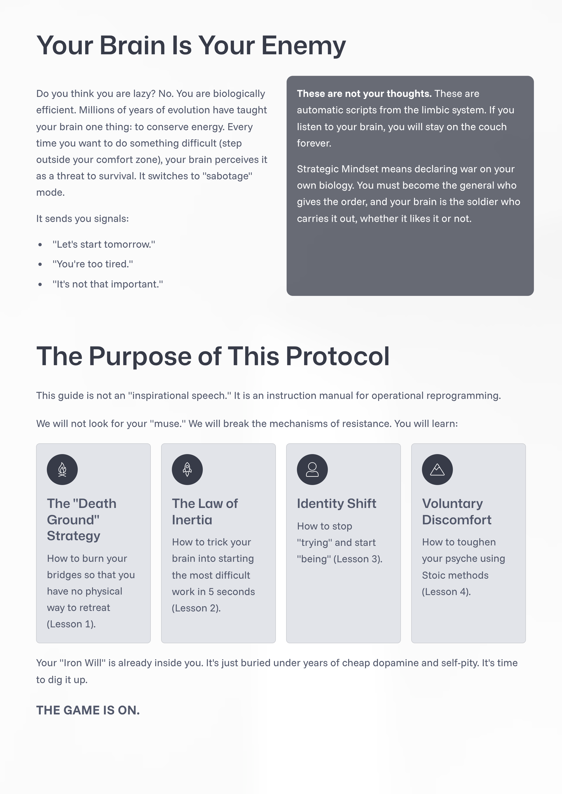 - ✅ GUIDE 1: THE IRON WILL (PDF) — 19 pages of pure doctrine, psychology, and tactical instructions. No fluff.